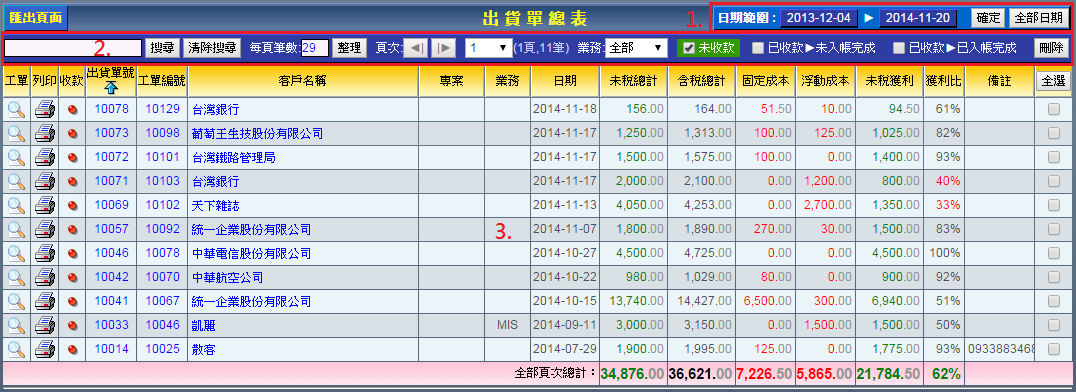 | 出貨單總表路徑:點選上方功能表列的「出貨單」選項即可進入出貨總表頁面。 出貨單總表可分為三大區域: 1. 日期範圍:控制時間區段,查詢該時間您想獲取的資料。 2. 搜尋功能區:提供各種條件的搜尋,快速篩選出您要的資料。 3. 出貨單資料顯示區。 |