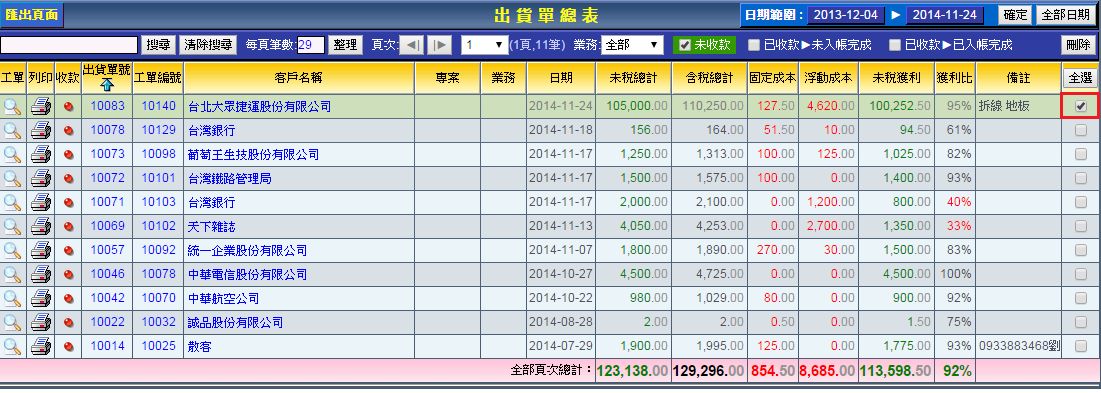 | 7. 如您要刪除出貨單,請於出貨單總表頁面勾選您要刪除的出貨單後,按「刪除」即可。 請注意:如果出貨單已有收款紀錄,則此筆出貨單無法被刪除。 |