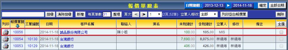 | | 4. 確定新增後即會跳轉至報價單總表,您可立即看到新增的報價單相關資訊。點選報價單號可再編輯。 |
