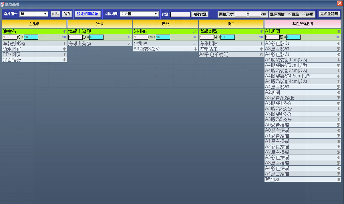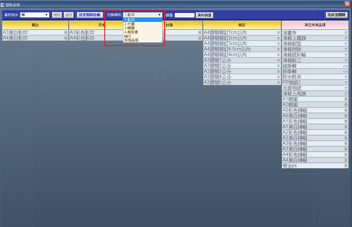 | 7. 進入選取品項設定畫面,您可以選擇之前您在「定義」設定好的製程從中選擇品項,也可以選擇「所有品項」從中挑選。 |