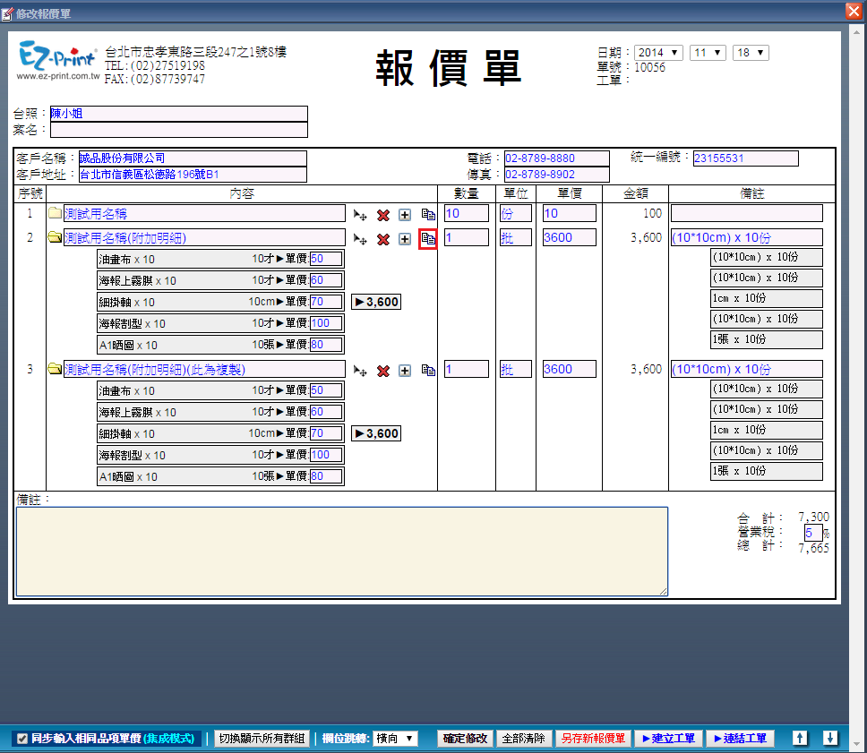 | 14. 如要新增一份同樣的內容,點選紅框處「複製」圖示即可將所選擇的內容完整複製於本報價單內,包含 「名稱」、「數量」、「單位」、「單價」、「備註」等資訊。 |