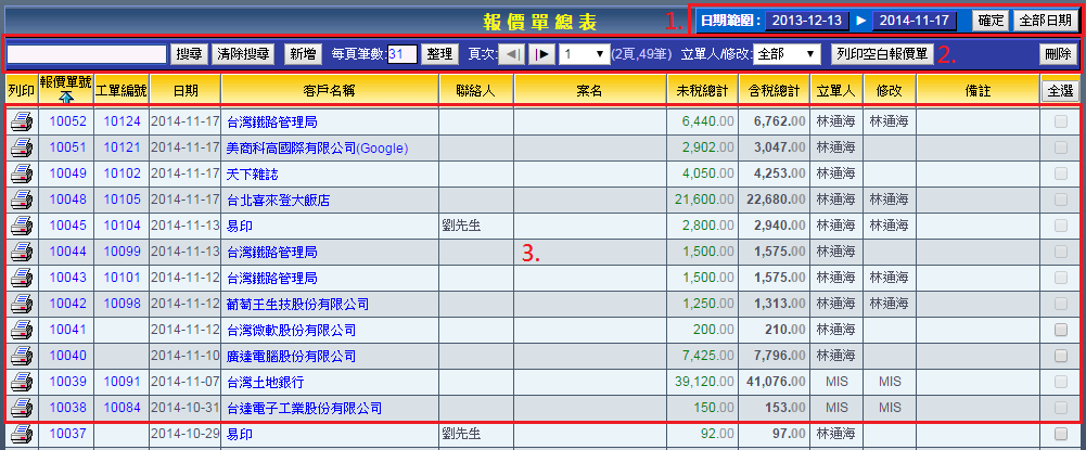 | 報價單總表路徑:點選上方功能表列的「報價單」選項即可進入報價單總表頁面。 報價單總表可分為三大區域: 1. 日期範圍:控制時間區段,查詢該時間您想獲取的資料。 2. 搜尋功能區:提供各種條件的搜尋,快速篩選出您要的資料。 3. 報價單資料顯示區。 |