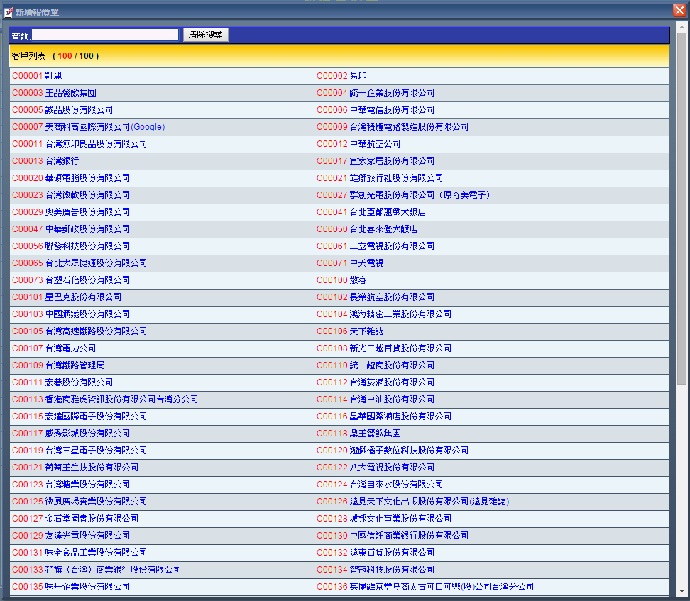 | 2. 進入報價單新增頁面後,點選「顯示全部」從中選擇您要新增報價單的對象,或者在左上查詢列輸入您要查 詢的對象。 |