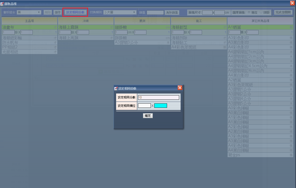 | 9. 設定相同份數:如有多量品項需要設定同樣份數時,點選「設定相同份數」,在彈出的設定視窗輸入您要的 份數並指定此份數的欄位(您可以兩個欄位都選擇)。設定好後請按「確定」。 |