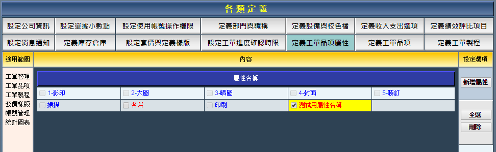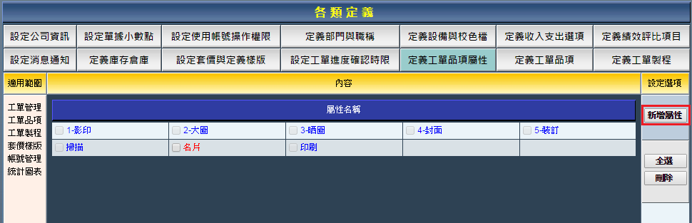 | 設定定義工單品項屬性:進入此設定頁面的路徑為「定義」→「定義工單品項屬性」。 (若沒有在上方選項欄看到「定義」選項,請在最右方「其他功能」下拉選單搜尋。) ※此設定影響的範圍:工單品項所屬之類別歸類。 |