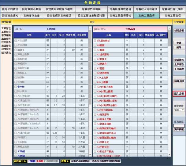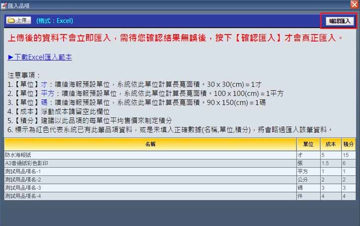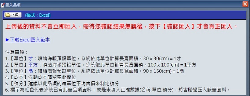 | | 若您有大量的品項需要新增至易印BPM工單管理系統內,可參照以下步驟處理。 |  | 1. 點選「匯入品項」,便會彈出新的詢問視窗。 |