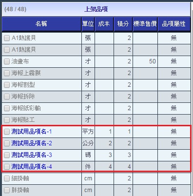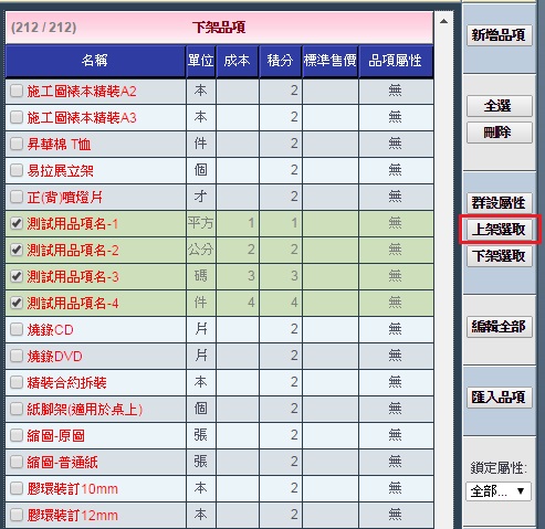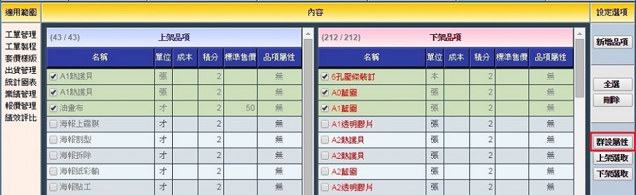 | | 本操作可將尚未歸類品項屬性的品項做屬性設定。 |  | 1. 勾選您要設定屬性的產品。您可以只選擇「上架品項」或「下架品項」,也可以綜合勾選。 確定後請點選右側的「群設屬性」。 |