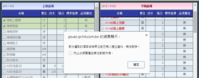 | 3. 若您勾選要刪除的品項已有其他資料與之連結,則要在刪除時會彈出阻擋視窗。若您要刪除必須先取消所有 與欲刪除品項的相關連結可繼續進行刪除動作。 已有資料連結的品項會以灰色字體表示。 |
