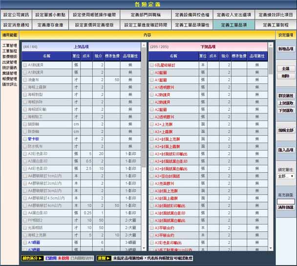| 設定定義工單品項:進入此設定頁面的路徑為「定義」→「定義工單品項」。 (若沒有在上方選項欄看到「定義」選項,請在最右方「其他功能」下拉選單搜尋。) ※此設定的目的:定義貴公司旗下的所有生產產品。 |