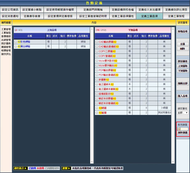 | 2. 高亮篩選:在「高亮篩選」的輸入框中輸入您要搜尋的字串,系統即會以所有產品品項名中符此字串之條件 列出符合結果,並且結果中產品品項名中符合您輸入的字串條件會以黃標註記。 |