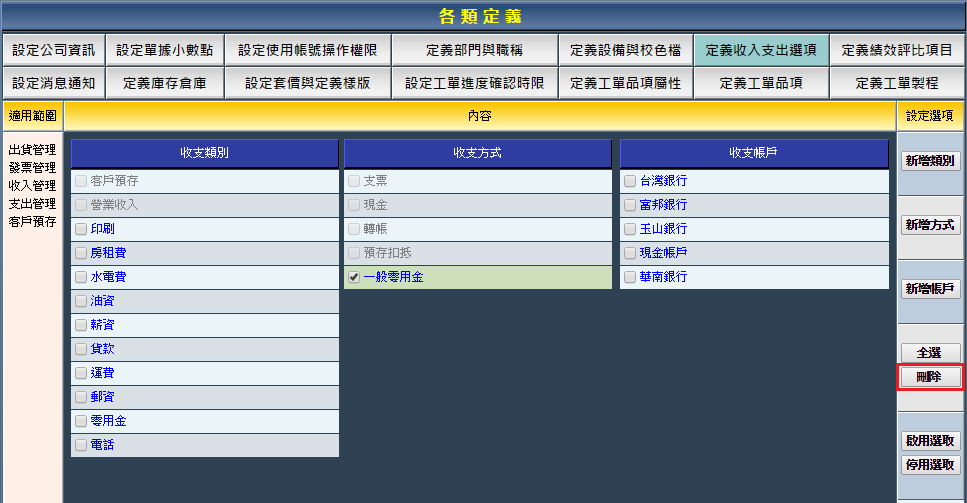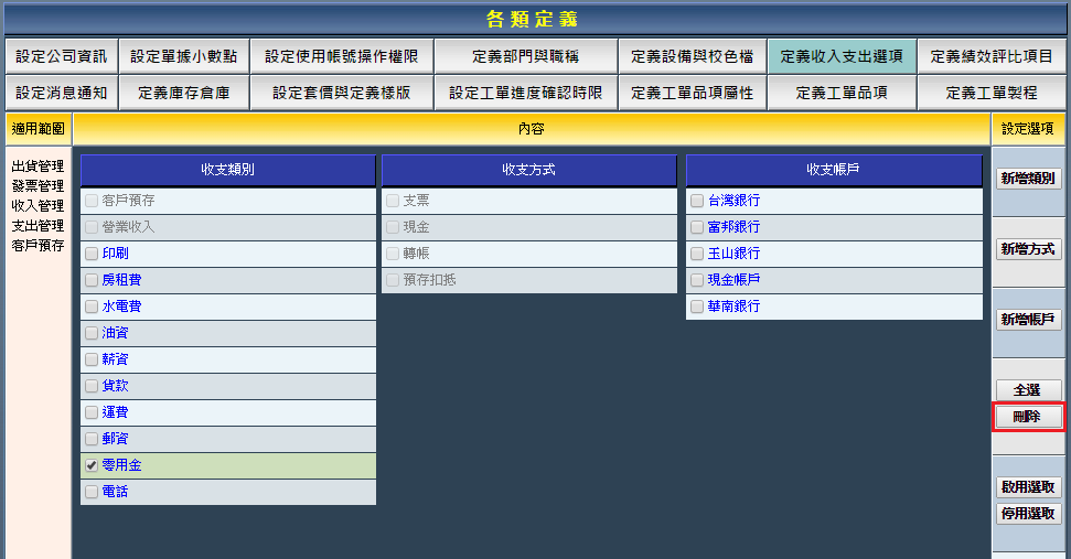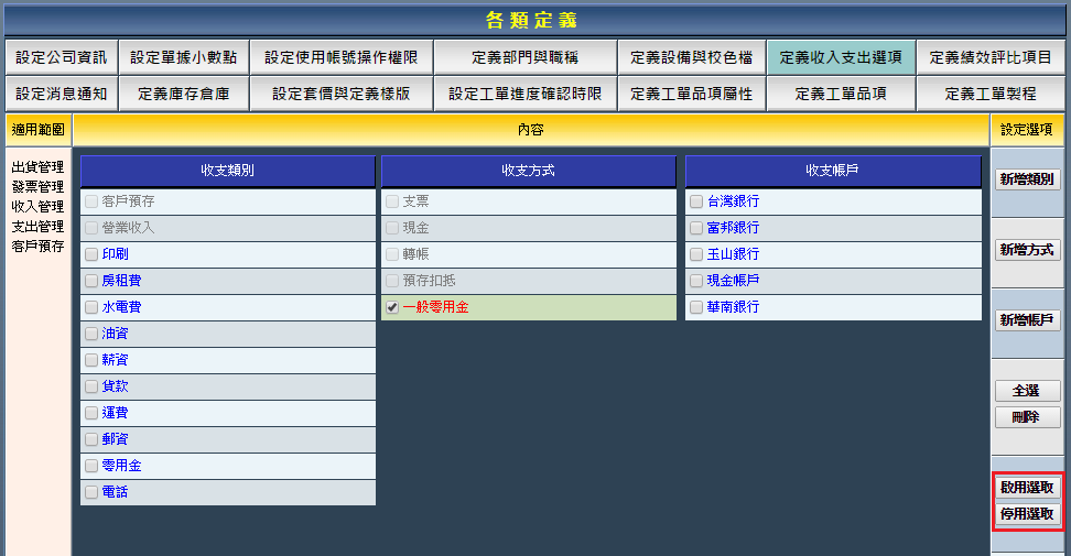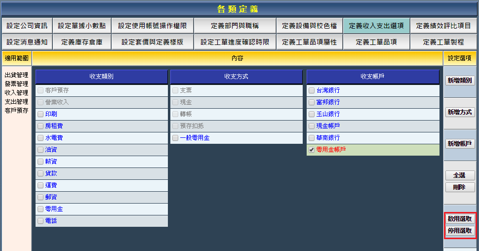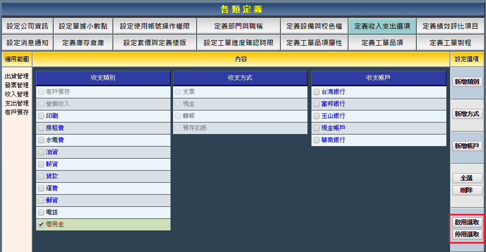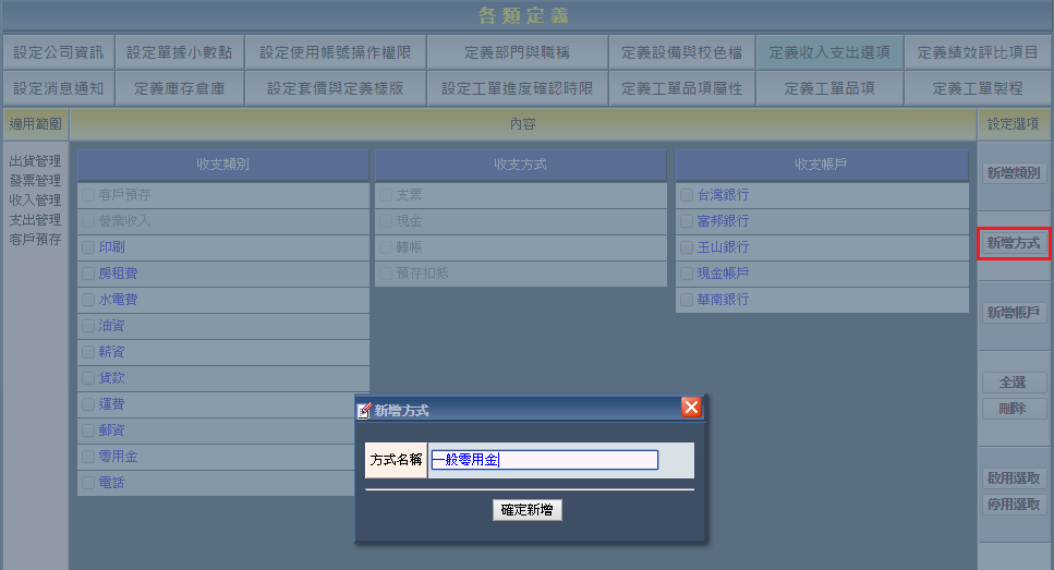 收支方式的新增、啟用、停用與刪除