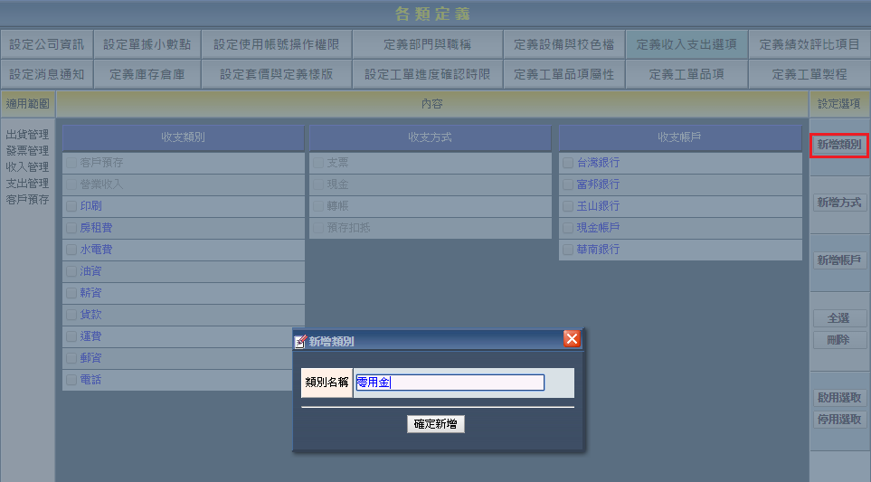 收支類別的新增、啟用、停用與刪除