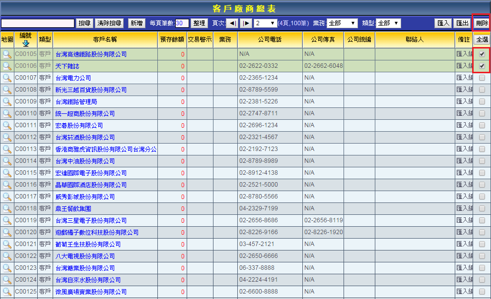 |  | 1 .若要刪除客戶資料,請在最右側勾選您要刪除的資料,確定後按「刪除」即可將所選的資料刪除。 如有大量資料需要刪除,點擊「全選」即能勾選目前頁面顯示的所有客戶廠商資料,再進行刪除的操作。 但該筆客戶廠商資料已有交易工單資料連結的話,則該筆客戶廠商資料無法被選擇刪除。