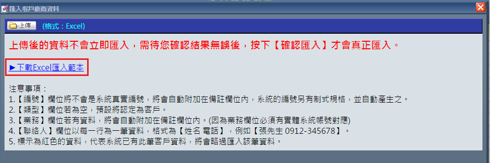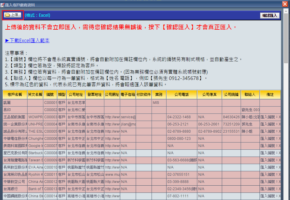 | 4. 回到易印ERP管理系統,點選左上角「上傳」並選擇剛剛儲存好的「客戶匯入範本.xlsx」檔,您即可以預覽 剛剛所輸入的資料其對應欄位的資料是否正確,請注意此時資料僅供預覽,並未正式上傳至易印ERP管理系 統內。欄位標示紅底表示系統內已有此筆資料,儲存時將會略過。如確認無誤點選右上角「確認匯入」,即 能將資料存至系統內。 |