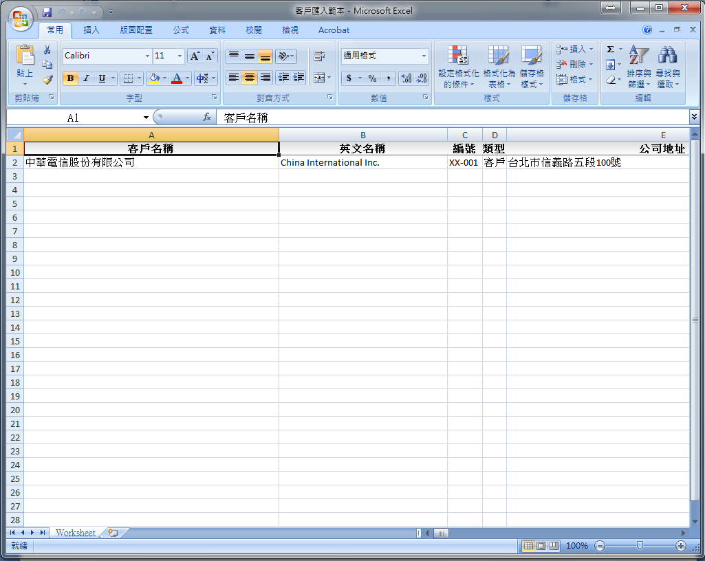 | 3. 打開下載的「客戶匯入範本.xlsx」,依序會有「客戶名稱」、「英文名稱」、「編號」、「類型」等共15個 欄位。請依各欄位的名稱輸入相對應的資料,輸入完畢後請儲存。 |