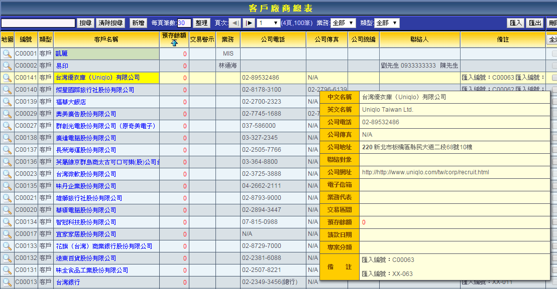 | 2. 點選客戶廠商名稱,會彈出獨立的檢視視窗,您可以直接在此視窗對此客戶做編輯動作。 |