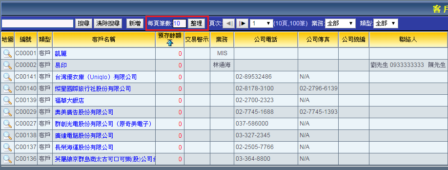 | 3. 您可以自行決定一次要呈現的客戶廠商資料筆數方便您的瀏覽。在「每頁筆數」欄位輸入您一次想瀏覽的資 料量,系統內建預設的筆數為30筆。 |