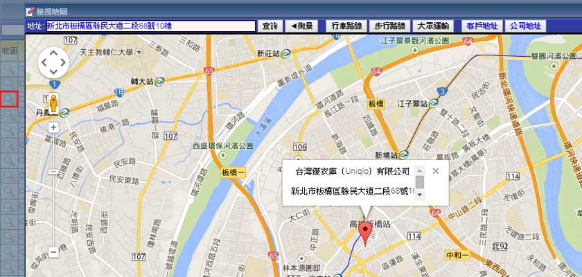 | 3. 如果您在增加客戶資料時有填寫地址,點選客戶資料表最左側的「地圖」的放大鏡圖示即可自動啟動Google 地圖顯示該客戶廠商的所在位置,也可直接使用Google地圖提供的其他功能,如路線規劃、街景服務、地址 查詢等等。 |