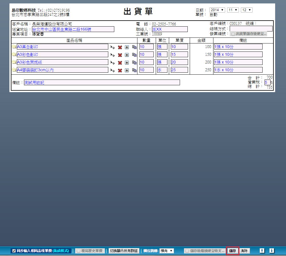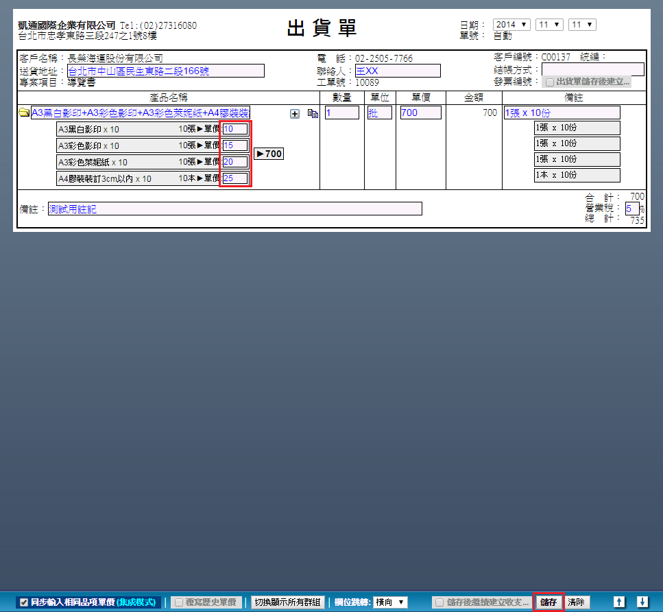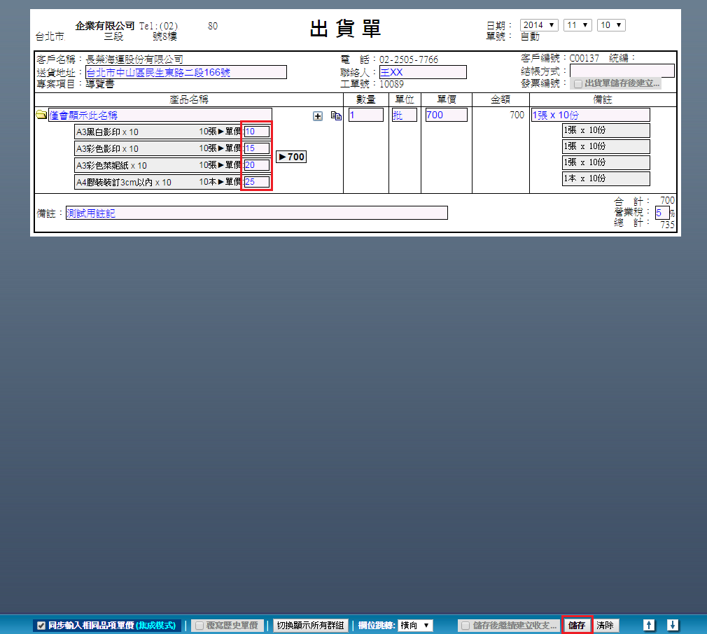 | 2. 點選後畫面會跳轉至出貨單設定頁面,輸入單價(如果您已在「定義」中的「設定套價與定義樣版」中設定好 各品項的單價,此處會自動帶入您已設定好的價格,但還是可以修改。)、營業稅率等相關資訊,產品名稱欄 位會自動帶入本次作業流程用到的所有品項並以「+」號串連。確認無誤後按底部操作欄的「儲存」。 |
