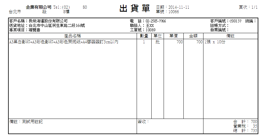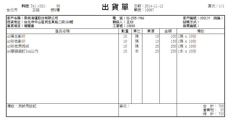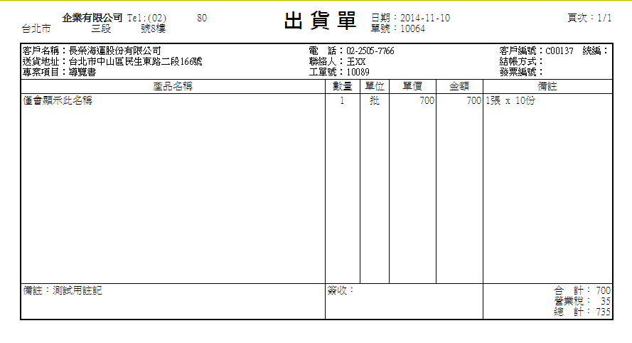 | 4. 將滑鼠游標移至列印符號並點選,進入列印預覽畫面,您會看到「產品名稱」欄位區域顯示您開立本工單所用 到的所有品項細節明細,以條列式列出於出貨單上。此為「檔名集成模式」與「品項集成模式」皆不勾選的輸 出結果 |