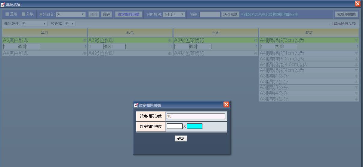 | 4. 點擊後即會彈出新視窗,點選您要設定相同數字的欄位(也可以兩個都選擇),並且在設定相同份數欄位輸入 您要的份數。 |