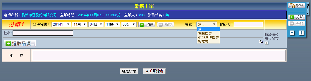 | 1. 選擇好客戶後,進入工單資料新增畫面,各選項設定目的說明如下: 交件時間:設定此筆工單的交件日期。預設時間為此筆工單開立時間的24小時後。 專案:若您在輸入此客戶廠商資料時有輸入專案資訊,可選擇此筆工單的專屬專案名。 聯絡人:與此筆工單來往客戶的主要聯絡人。 選取品項:進入此筆工單的製程選擇。 檔名:此筆工單的主旨。建議填寫。 備註:對此筆工單需要特別註記的事項。 |