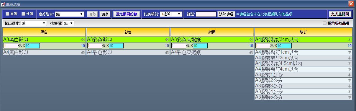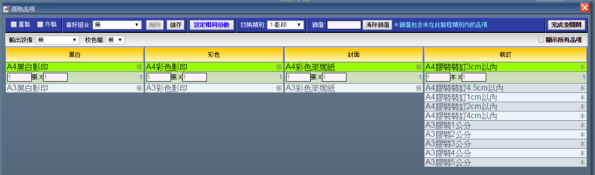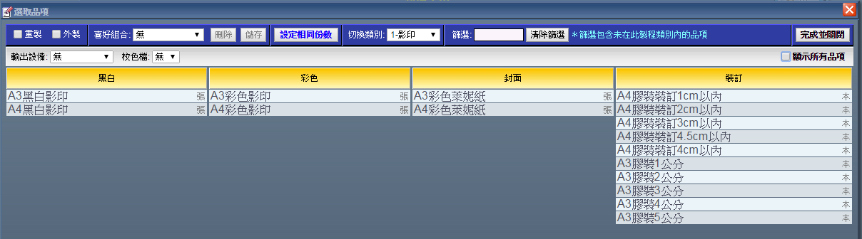 | 2. 點選「選取品項」,進入工單製程畫面,各功能如下: 切換類別:若您在「定義工單製程」時有規劃出多樣製程,即能在此處做切換。 篩選:提供快速搜尋需要的品項的功能。 輸出設備與校色檔:若您在「定義設備與校色檔」中有建立現有機型與校色檔資料,可紀錄本次工單所使用 的設備校色資訊。 |