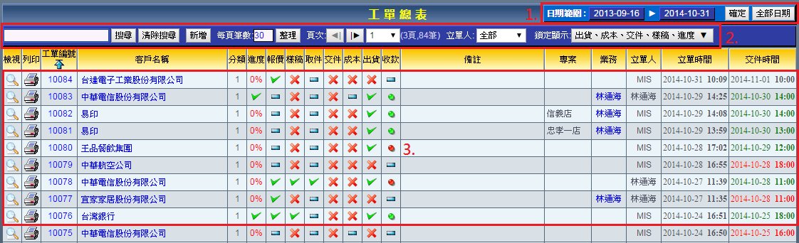 | 工單總表路徑:點選上方功能表列的「工單」選項即可進入工單總表頁面。 工單總表可分為三大區域: 1. 日期範圍:控制時間區段,查詢該時間您想獲取的資料。 2. 搜尋功能區:提供各種條件的搜尋,快速篩選出您要的資料。 3. 工單資料顯示區。 |