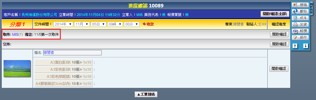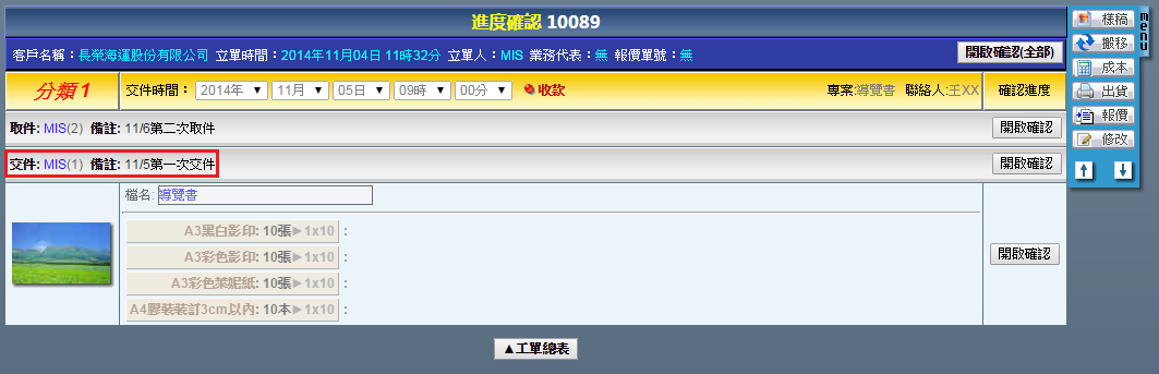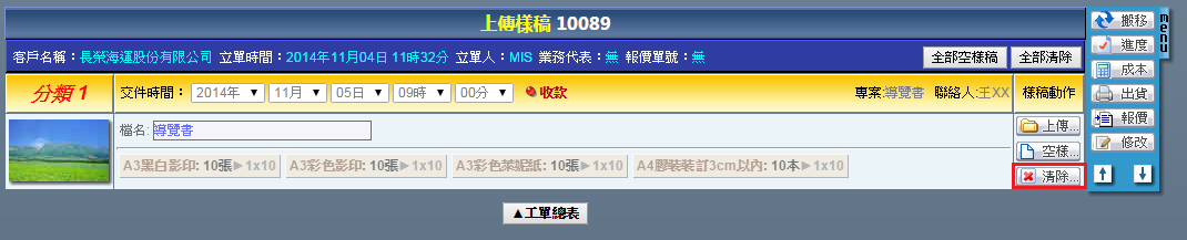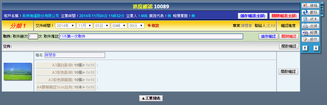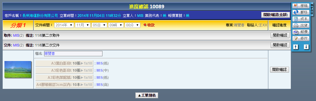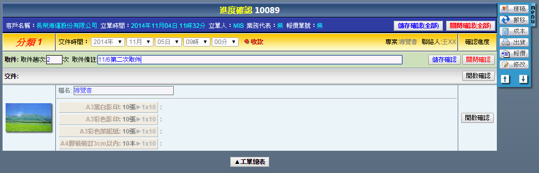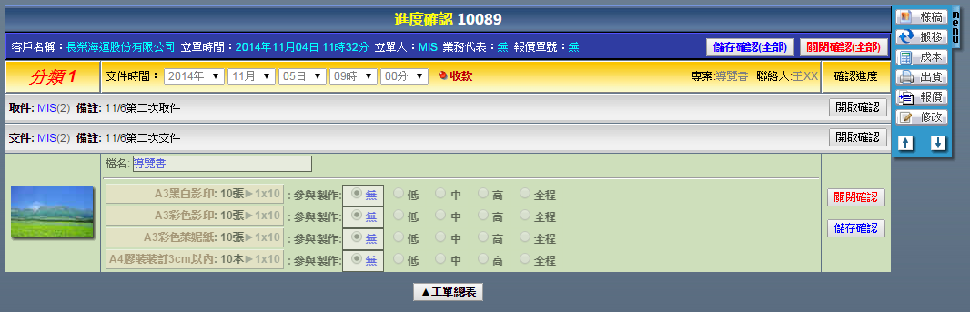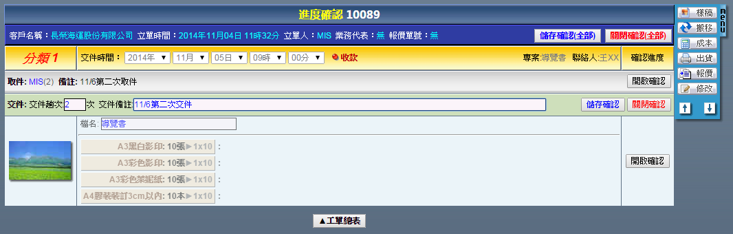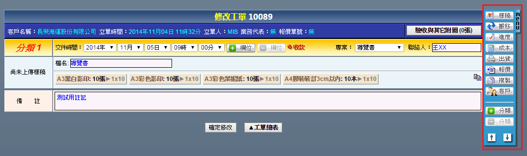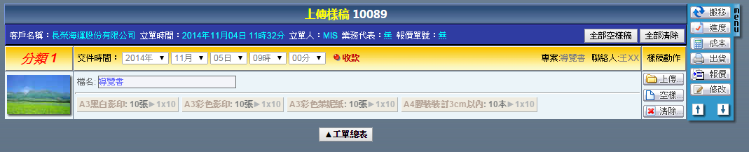 | 點選工單編號進入修改工單頁面,右方「MENU」功能列提供了各式工單的操作功能,說明如下: 樣稿:上傳本次工單的成果圖片,供本次作業成果參考或者日後搜尋時確認用。 搬移:刪除此筆工單。 進度:確認此筆工單的各階段作業進度。 成本:輸入此筆工單內,當初並未設定的浮動成本。 出貨:將此筆工單轉換成出貨單。 報價:將此筆工單轉換成報價單。 複製:複製此筆工單。 客戶:更換此筆工單的客戶。 |