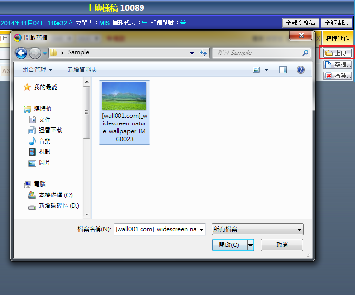 |  | | 1. 點擊「樣稿」,在樣稿動作區選擇「上傳」,在彈出的新視窗選擇您要上傳的樣稿圖檔。 |
