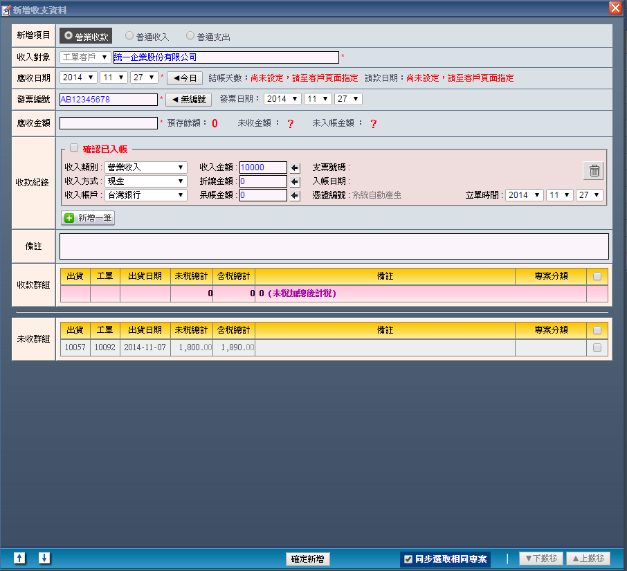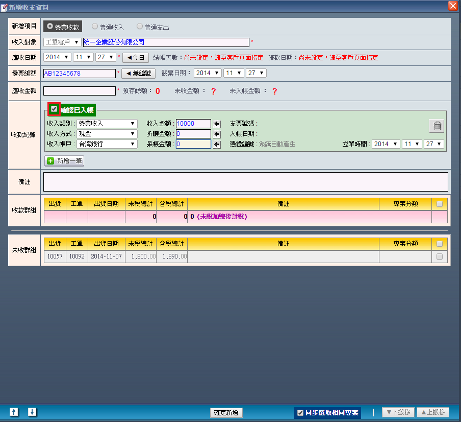 | 5. 若此筆帳務已經確定入帳,請勾選「確定已入帳」,收款紀錄的背景顏色也會由紅轉綠給予使用者提示。 以上不管有無勾選「已確定入帳」,都可在將所有必要的收款資料填選完畢後,按下「確定新增」便能完成 建立一筆屬於「營業收款」的收支紀錄。 |