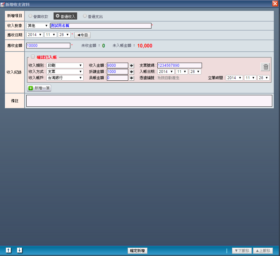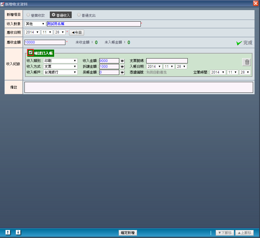 | | 7. 若此筆帳務已經確定入帳,請勾選「確定已入帳」,收款紀錄的背景顏色也會由紅轉綠給予使用者提示。 以上不管有無勾選「已確定入帳」,都可在將所有必要的收款資料填選完畢後,按下「確定新增」便能完成 建立一筆屬於「普通收入」的收支紀錄。 |