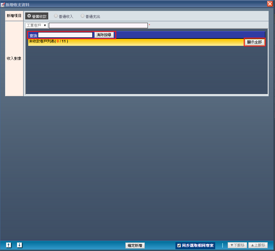 | 3. 營業收款:如果選擇「營業收款」,您必需先輸入客戶名,也可透過「查詢」找尋您要的客戶名,或者點選 「顯示全部」來找尋您要的客戶名。 |