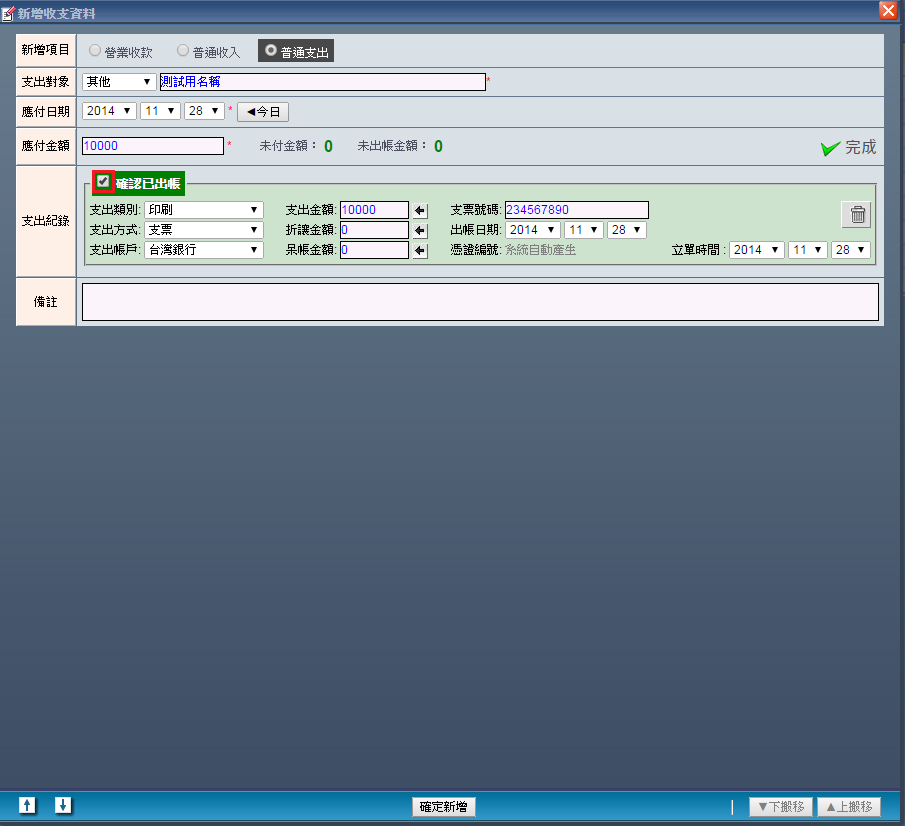 | | 9. 若此筆帳務已經確定入帳,請勾選「確定已入帳」,收款紀錄的背景顏色也會由紅轉綠給予使用者提示。 以上不管有無勾選「已確定入帳」,都可在將所有必要的收款資料填選完畢後,按下「確定新增」便能完成 建立一筆屬於「普通支出」的收支紀錄。 |