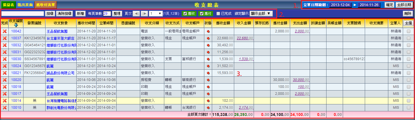 | 收支總表路徑:點選上方功能表列的「收支」選項即可進入收支總表頁面。 收支總表可分為三大區域: 1. 日期範圍:控制時間區段,查詢該時間您想獲取的資料。 2. 搜尋功能區:提供各種條件的搜尋,快速篩選出您要的資料。 3. 收支資料顯示區。 |