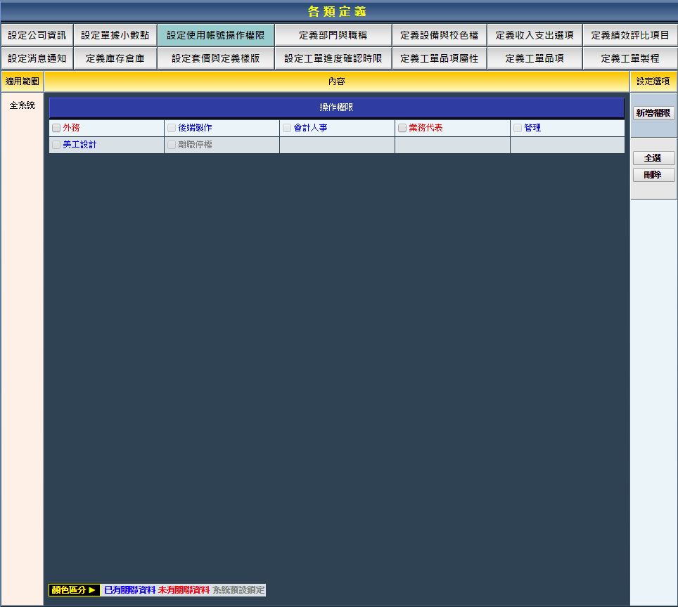 | | 設定使用帳號操作權限:進入此設定頁面的路徑為「定義」→「設定使用帳號操作權限」。 (若沒有在上方選項欄看到「定義」選項,請在最右方「其他功能」下拉選單搜尋。) ※此設定的目的:設定有使用易印ERP管理系統的鎖有帳號權限。 |
