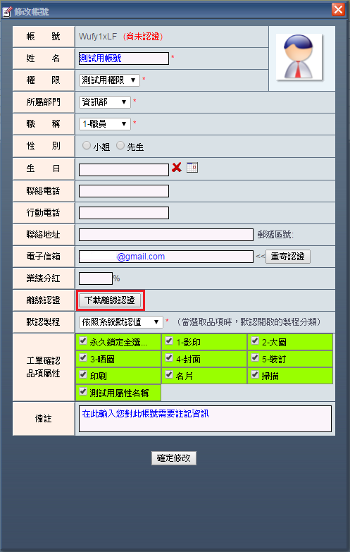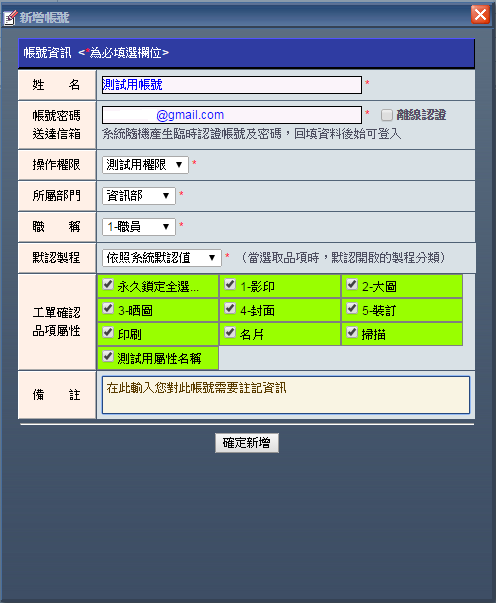 | 2. 在帳號總表點選「新增」便會彈出新增帳號視窗,填寫好相關資訊後,按「確定新增」。 其中「操作權限」便是決定此帳號要從「定義」的「設定使用帳號與操作權限」的權限名稱中做連結, 此選擇即會影響此帳號在易印ERP管理系統中的操作權限大小。 如果該員工尚未有電子郵件信箱或者網路環境不佳,您可勾選「離線認證」。 |