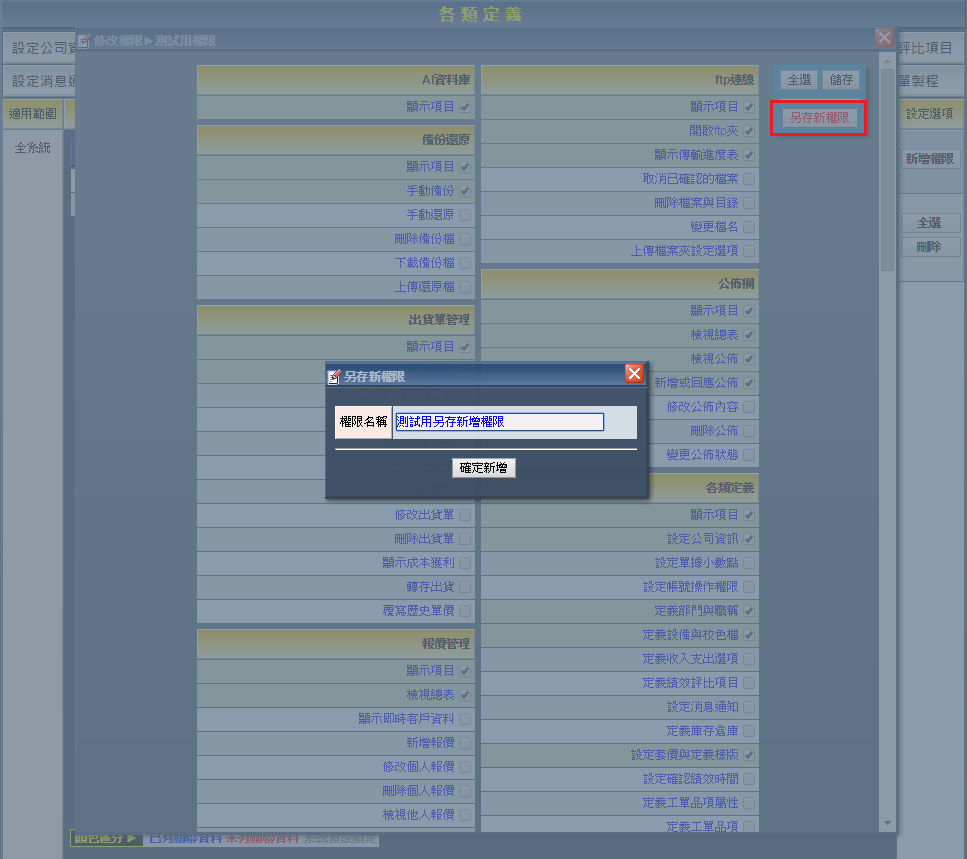 | 4. 若您想新增的權限和現有的只有少許差異,您可以開啟後將有差異的部分勾選或取消,再點選「另存新權限」並輸入名稱即可。 |
