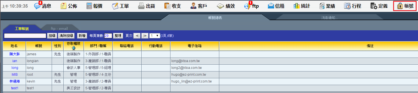 |  | 1. 點選上方「帳號」選項,進入帳號總表。 (若沒有在上方選項欄看到「帳號」選項,請在最右方「其他功能」下拉選單搜尋。) |