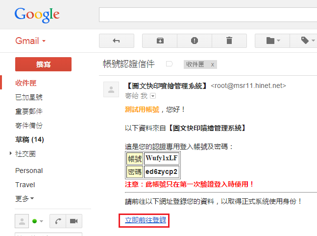 | 3. 確定新增完畢後,請先移至創立帳號時所登記的信箱,您會收到一封由易印ERP管理系統寄出的帳號啟用信 函。您可以另開新視窗開啟易印ERP管理系統或者點選「立即前往登錄」繼續帳號開通流程。 (此處以Google信箱做為示範,各家信箱呈現方式會略有差異,但不影響後續操作流程。) |