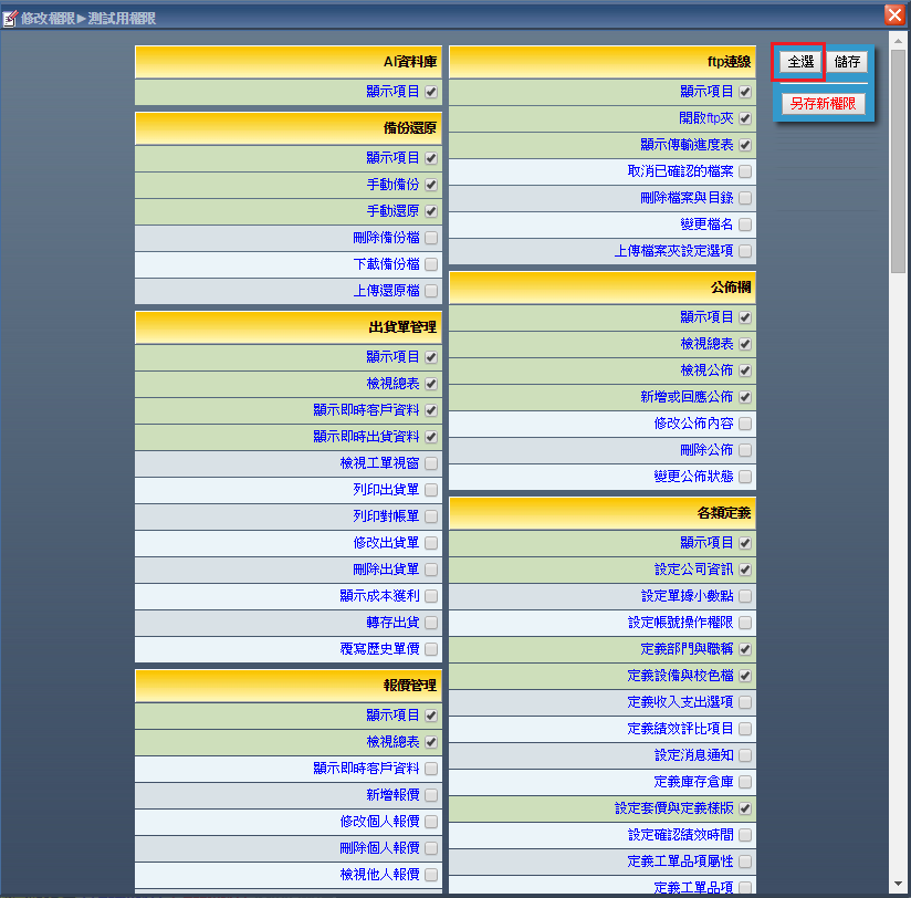 | 3. 點選您剛新增加的權限名會彈出系統現有可操作權限的列表,在此勾選您要給予此權限名稱的操作範圍,或者選擇「全選」給予此帳號所有操作權限。但除非是系統管理者,否則不建議使用全選的方式來給一般帳號做使用。 確定好後點選「儲存」,便完成操作權限的設定。 |