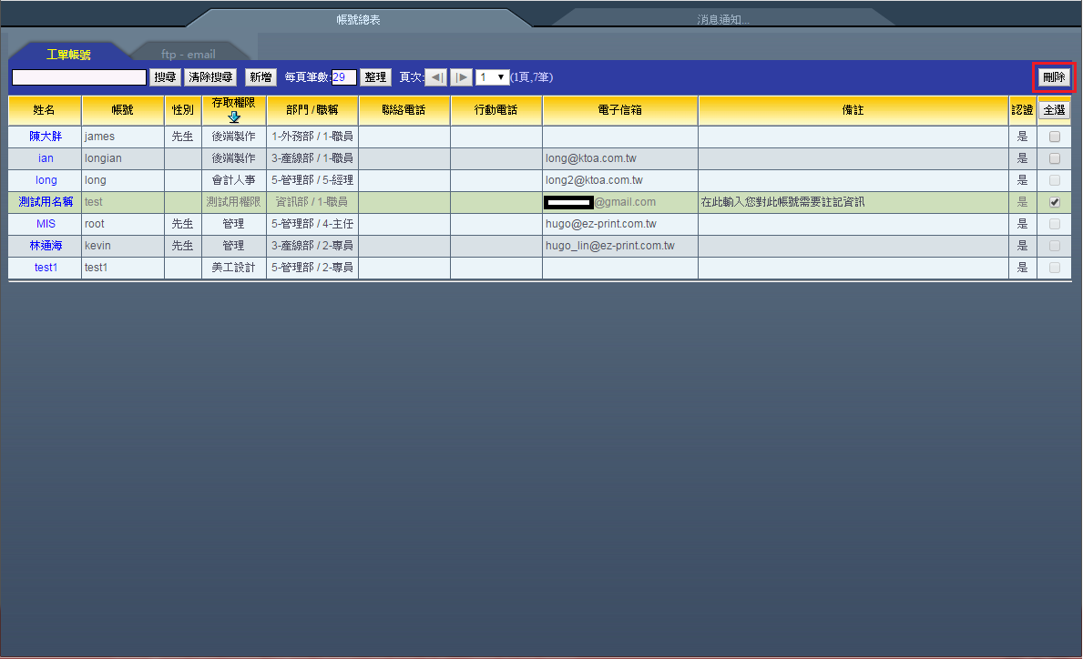 |  | 1. 要刪除帳號、請以有系統管理員權限的帳號(如root)登入,進入帳號清單總表,勾選您要刪除的帳號後點選右上角的「刪除」即可。 請注意:若要刪除的帳號已有執行過工單或者其他工作,則此帳號無法被刪除。 |