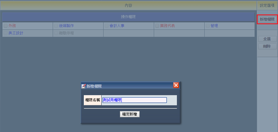 |  | 1. 要增加新的權限,點選「新增權限」,便會彈出新的視窗,請在此輸入您要的權限名稱。確定後按「確定新 增」。 |
